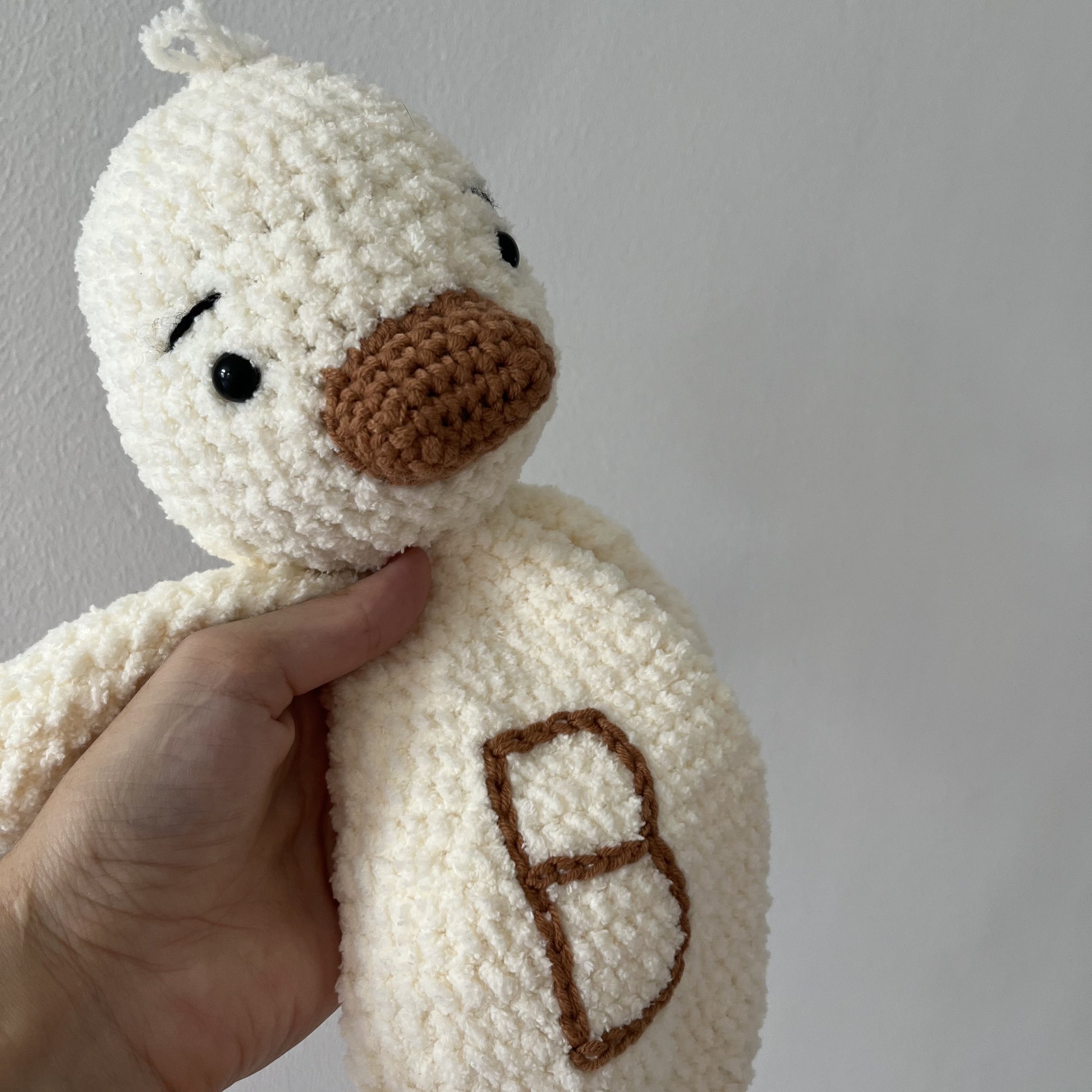 Handmade Crochet Duckling Lovey crafted from soft, plush yarn.